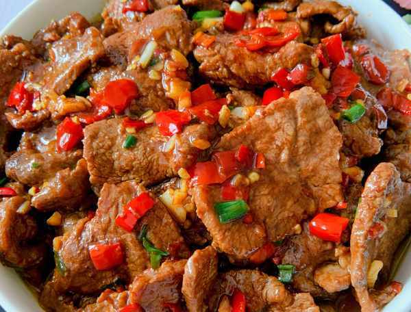 2.油熱放牛肉炒熟盛出,底油炒香大蒜,放兩勺剁辣椒,放香蔥炒勻。