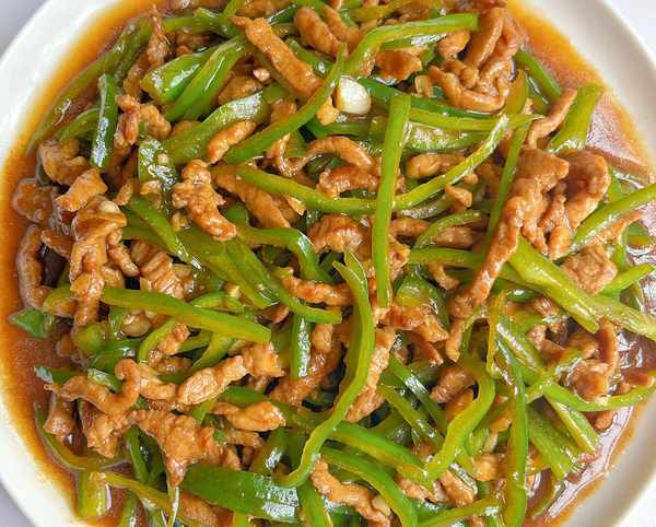3、鍋中放油,炒熟肉絲盛出,底油煸香蒜末,倒入青椒絲炒斷生,加入肉絲和醬汁大火炒勻即可出鍋