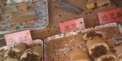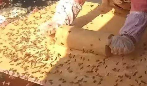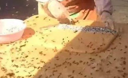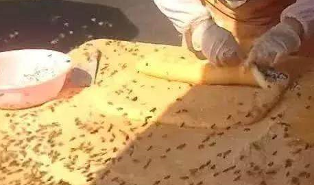 這究竟是什麼情況?蜜蜂竟然還是活生生的!制作過程沒有人敢接近上前,大媽把自己包裹的嚴嚴實實,就站在蜜蜂堆裡制制做這道小吃.....不得不說這極其奇葩....大媽在桌上放瞭一塊由糯米加工成的糯米團,瞬間蜜蜂就爬滿桌子和糯米團。