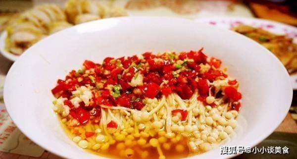 1、金針菇切去根部,洗凈瀝幹,裝盤;