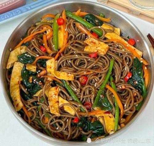 第五道菜:涼拌蕎麥面。蕎麥面是富含纖維素、維生素和礦物質的食品,能提高腸道蠕動,促進體內毒素的排除,具有補充能量的作用。