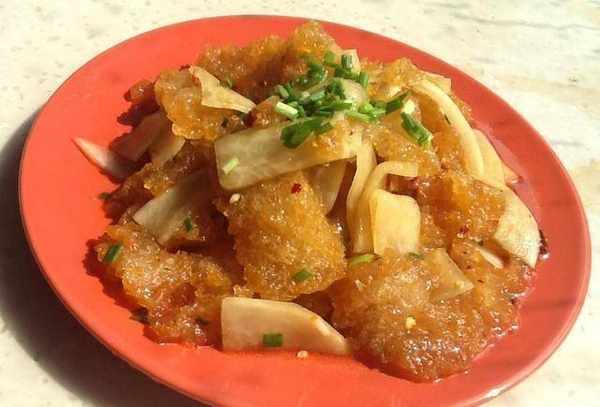 配料:炸豬皮;白蘿卜;韭菜;生抽、辣椒油、辣椒醬。;鹽、油、香油。;食用堿
