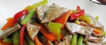 4.取出清空備用。鍋中油燒熱,加入薑絲略炒,再加入豬肝、胡蘿卜、青紅椒和芹菜炒1分鐘,加鹽和蠔油炒勻。