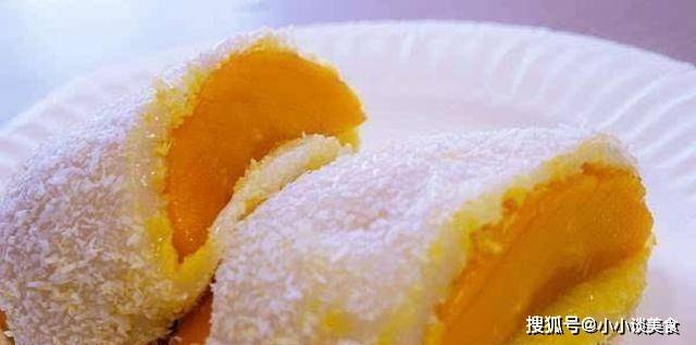 6.把芒果丁放在上面,做成一個像湯圓一樣的球。
