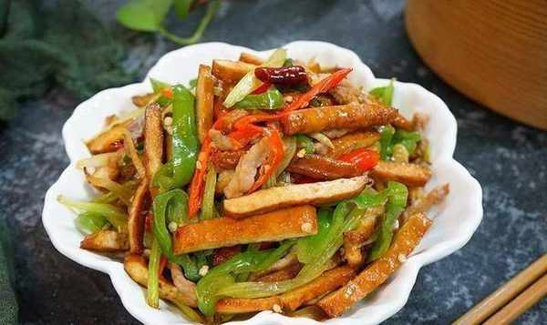 3.幹豆腐容易熟。倒入鍋中煎兩三分鐘。然後加入切好的青紅椒、半勺生抽、半勺料酒、少許鹽雞粉,拌勻即可上桌。
