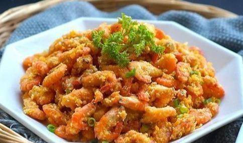 材料:小河蝦、咸蛋黃、雞蛋、面粉、淀粉、鹽、辣椒粉、面包屑。