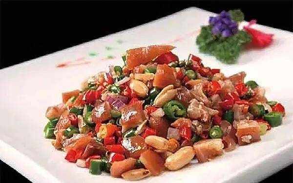 2、將豬蹄放回鍋中,用青紅椒、小米椒、洋蔥、青椒等炒熟,待鍋熟後放入醉豆炒勻,即可出鍋。鍋。