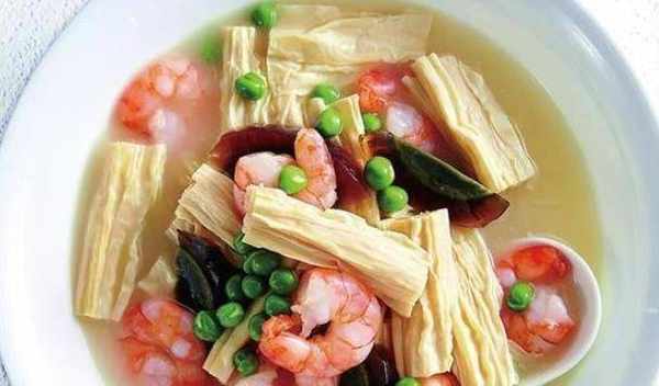 材料:鮮腐竹250g/蝦仁150g/皮蛋1隻、青豆30g/白胡椒4g/鹽5g、蔥10g/薑10g/香油3ml、色拉油10ml/花生油5ml/雞高湯350ml