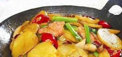 5、加入之前炸好的薯片,翻炒,加入醬油、鹽、味精,邊炒邊攪拌,撒上清水;