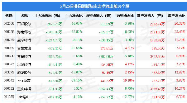 從資金流向上來看,當日非白酒板塊主力資金凈流出1.1億元,遊資資金凈流出5663.02萬元,散戶資金凈流入1.66億元。非白酒板塊個股資金流向見下表: