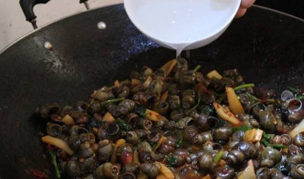 第四步:關鍵的一步來瞭,把田螺放到鍋中,爆炒三五分鐘後,再在鍋中加入適量的啤酒,這樣東西有提鮮去腥的作用。加入瞭啤酒的田螺,腥味會消散的無影無蹤!仍是大火,使用大火收汁後,把田螺盛出來就可以吃瞭。加上瞭這一步的田螺,一點兒腥味都沒有,跟外面燒烤攤做的特別像。