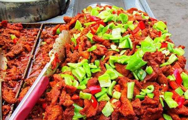 我說這是肉夾饃裡面的肉,你信嗎?這是真的,我們這裡一個大型市場門口,就在賣這些,看著特別的誘人。