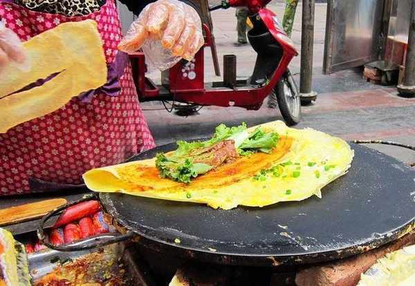 雞蛋灌餅也是一樣,到我們這裡入鄉隨俗瞭,愛吃辣,就連雞蛋灌餅,都可以加虎皮辣椒