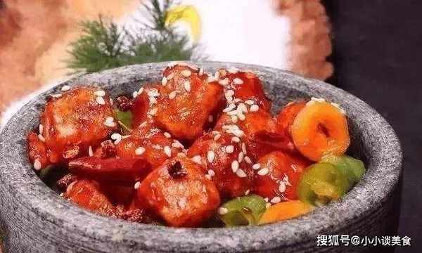 3、鍋中放入底油,加熱至40%熱。加入幹紅辣椒10克,白蠟8克爆香。加入紅辣椒醬60克、青椒塊60克、蔥40克。鴨肝塊快速煎熟,關火倒入兩個熱石鍋中。