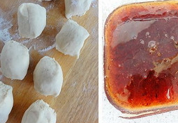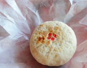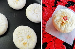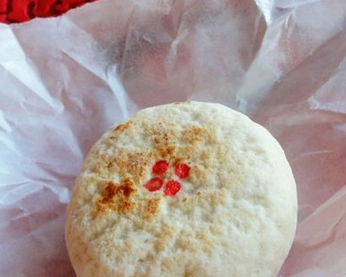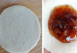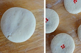 4、將適量的桂花醬放置在面片中間,像包包子一樣將收口捏緊,收口處朝下壓扁、搟圓。表面用筷子蘸少許食用紅色素點幾個紅點。