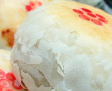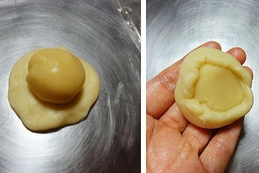7、將水油皮包入一顆油酥,用虎口慢慢的向上推著包入。