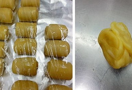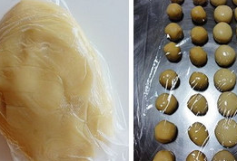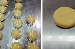 6、分割水油皮每個21g,油酥每個15g,水油皮完成後要松弛10分鐘。一般先做水油皮再分割油酥,油酥完成後水油皮大概就可以包入瞭。