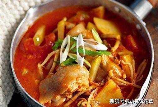5、加入魚腥草片、黃豆芽、番茄片、土豆片、芥末條,加入豬腿肉、鹽煮至材料軟爛,撒上青蒜片,淋少許青椒油。服務一張桌子
