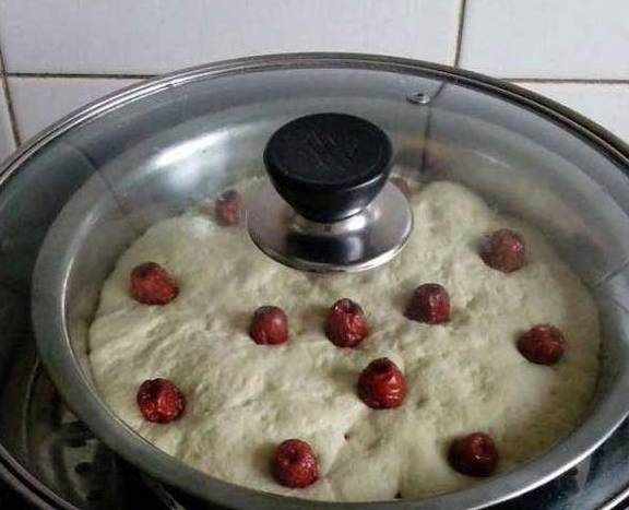 (5)發酵好的面團表面放少許紅棗肉;(也可以加上善良葡萄幹、幹果類的)
