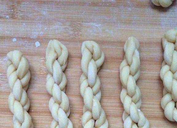 (7)兩隻手同時一頭向前搓,一頭向後搓,把長條擰起來,將長條兩頭拎起來,就會自己卷成麻花狀瞭。沾點水,把接口處捏在一起。