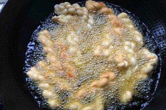 (8)鍋裡倒入2-3cm深的油,開小火加熱,等到鍋底的油花消失,放入一隻筷子,筷子的周圍會產生小泡,油溫就可以瞭。放入麻花,全程用小火,炸15-20分鐘,就會得到脆麻花。(如果用中火炸,3-5分鐘就會上色,炸出來就是軟心的麻花)