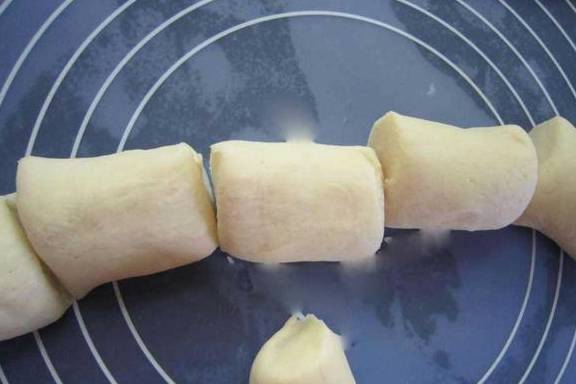 (5)松弛好的面團搓成條狀,用刀均分成10-12份。