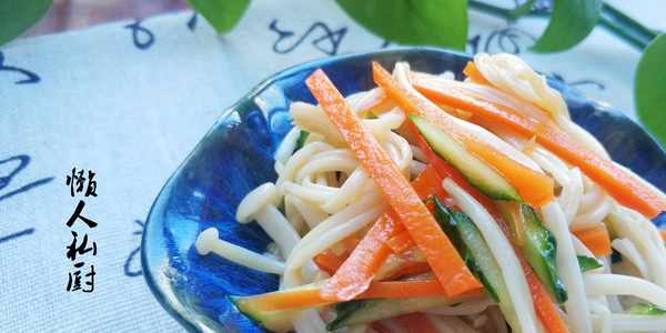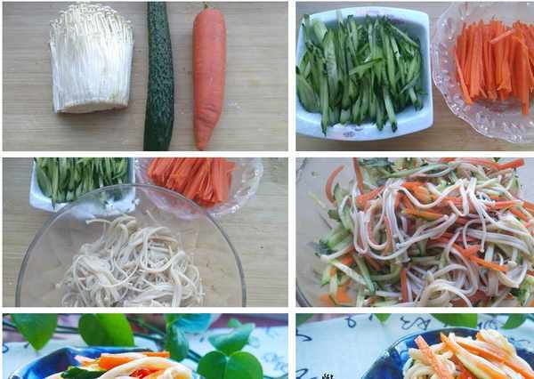 材料準備:金針菇300克,胡蘿卜100克,黃瓜100g,鹽、白糖、生抽、陳醋、芝麻香油少許。