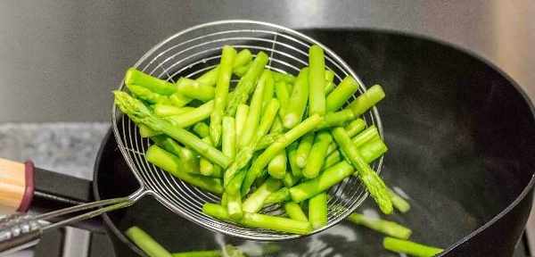 1.將蝦仁去除蝦線後,用少許淀粉反復揉搓一下,清洗幹凈後,擠幹水分放入碗裡,接著放入適量的蛋白,鹽和淀粉抓均醃制待用。蘆筍清洗幹凈後,用刀切成小塊,鍋裡熱水制沸騰時,倒入焯水制斷生,撈出控水備用: