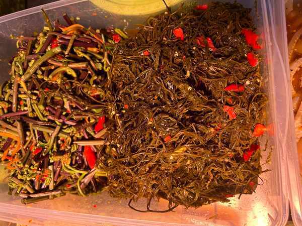 另一傢傣味涼菜店主玉兒行是西雙版納傣族人,她告訴記者,這個季節傣味涼拌最好賣,除瞭豆腐皮、藕片、海帶等最為常見的涼拌菜品,還會上一些應季蔬菜和水果,像涼拌木瓜絲、青芒、蕨菜、海菜等都是這個季節才有。隻見顧客挑選著各自喜愛的菜品,事先用秘制配料拌好的涼菜,被老板嫻熟的剪碎後便打包上秤,動作十分嫻熟。“這傢傣味很正宗,我一年四季都在這裡買,夏天來買的次數多一些,太熱瞭就想吃涼拌菜,木瓜絲酸辣爽口很下飯,隻有夏天才買得到。”正在夾涼菜的朱女士說道。