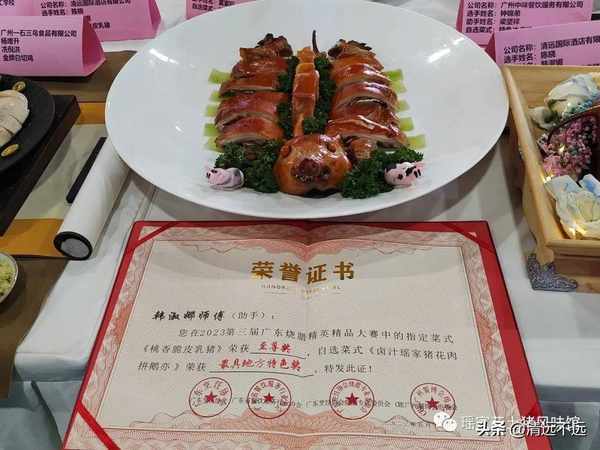 由瑤傢花梅花豬土豬肉為主打食材的《桃香脆皮乳豬》榮獲“至尊獎”、自選菜式《乳汁瑤傢豬花肉拼鵝亦》榮獲“最具地方特色菜”,另外在第十一屆中華粵菜廚師節上,陳曉大師還喜獲“特金獎”榮譽稱號!