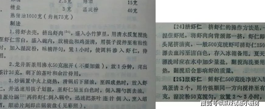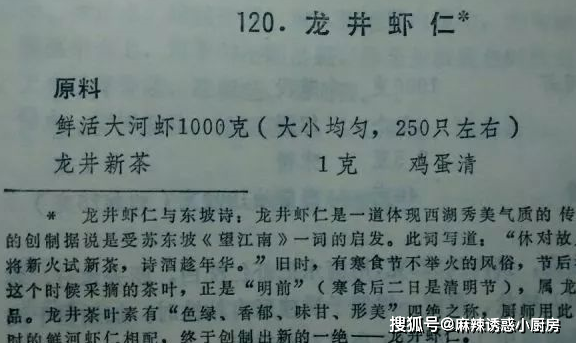 在網上翻到一份1988年版的龍井蝦仁菜譜,不知是不是老杭州做龍井蝦仁的標準做法。