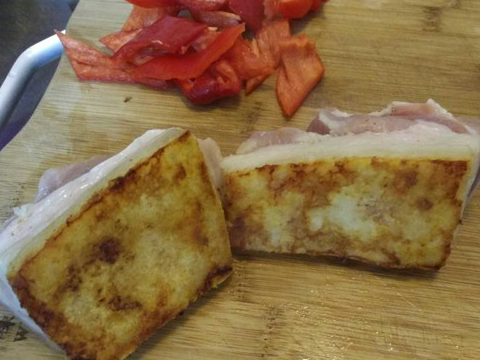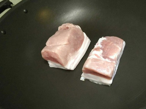 2.將鍋加熱,放入肉,註意是帶皮面貼鍋