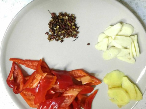 輔料:彩椒50克,白豆蔻2片,花椒10克,生抽15克,料酒5克,薑5克,郫縣豆瓣醬15克,糖2克,蒜3克,香葉2片,八角2個,桂皮1小塊,食用油適量