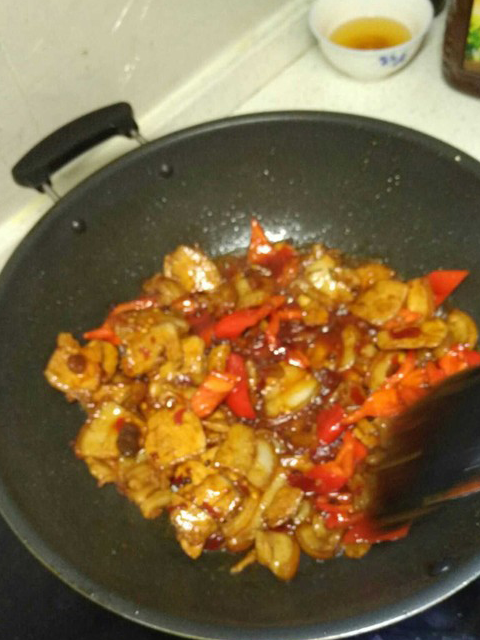 9.倒入彩椒,加入郫縣豆瓣,兩勺