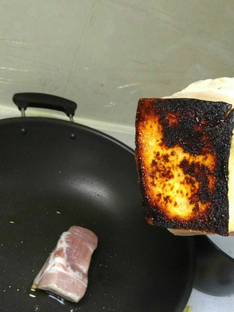 3.火溫要註意,中火,將肉皮面炕黑,隻炕肉皮這面,見底全黑出鍋