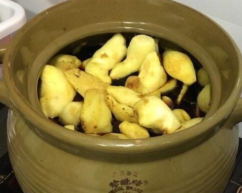 逆紋切(或者拍扁),用鍋小文火背幹或者晾幹,接著用瓦煲,倒甜醋.8分滿先煲,註意甜醋滾瞭會起泡,小心滾出煲,開煲,滾瞭薑會縮少,那個時候可以加入其餘薑進去!