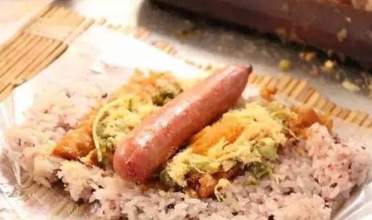 飯團也是一種很受歡迎的早點,蒸飯裡油條、咸蛋黃是標配,再加一點酸豇豆,一點榨菜,滿滿一口填充瞭整個口腔!