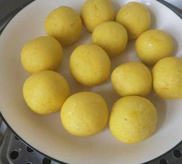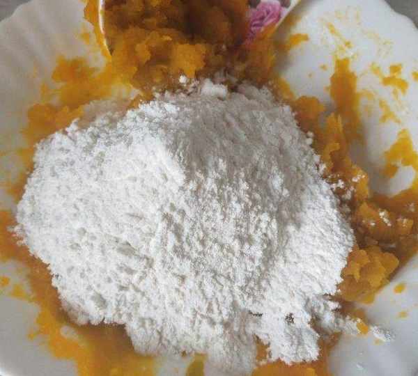 第1步、南瓜切片蒸熟壓碎,加糯米粉,比平時多加些,和成面團。