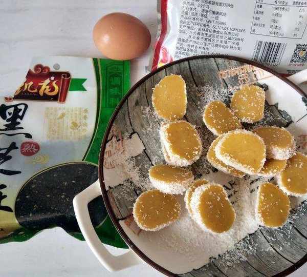 第7步、平底鍋放油,擺入蘸瞭雞蛋的糯米片,煎至兩面金黃。