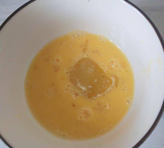 第5步、雞蛋打散,放入一片糯米片蘸上雞蛋。