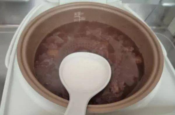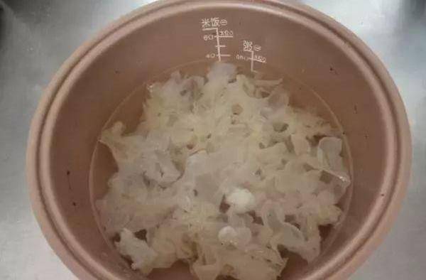 4.浸泡後的銀耳撕成小朵入電飯煲,加適量水煲。