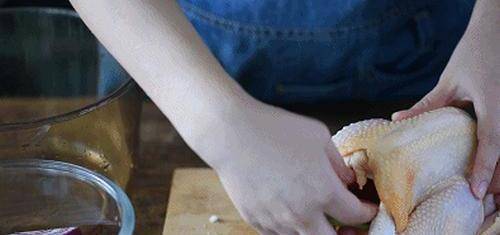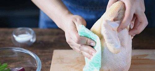 第三步:我們將走地雞清洗幹凈之後,用廚房用紙在它的表面吸幹水分。就可以在它上面抹鹽瞭,薑雞的裡裡外外都抹上食鹽。然後充分地將他做一個“馬殺雞”,讓食鹽融雞皮裡。