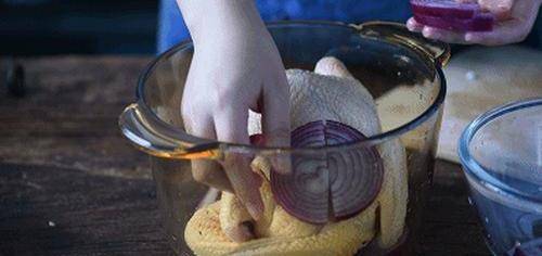 第五步:我們將烤箱先提前預熱五分鐘。然後再取出一個玻璃鍋,(如果我們傢裡沒有玻璃鍋的,可以直接用錫紙墊在烤盤上。這樣子也可以非常好的裹住雞肉,然後烘烤也是OK的。)我們將切好的洋蔥店在玻璃鍋的底部,然後再將醃制好的雞放到玻璃鍋中,在雞的上面再蓋一層洋蔥絲。然後我們將它放到烤箱裡。上下火220°,烘烤是十分鐘就可以出爐瞭。