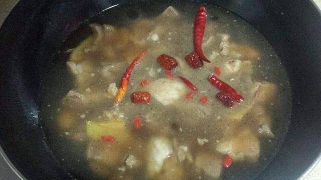 第六步:將大蔥和紅棗枸杞等東西放入,枸杞和紅棗是有補氣補血的功效的,吃瞭對身體非常的好。然後加入一點點的鹽,小火燜煮半個小時左右的時間。