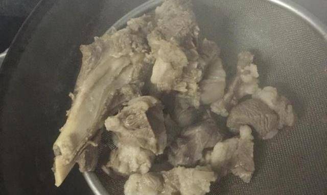 第二步:起鍋燒水,將羊肉撈出來晾幹水,然後放入冷鍋中等它燒開。給排骨焯水,將裡面的血水都給煮出來,這樣吃起來的口感會更加的好一點。等水燒開之後就拿出來瀝幹就可以瞭。