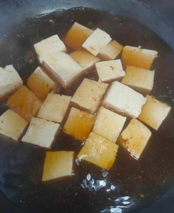 4.豆腐切塊,放入鍋裡焯一下水,再放點老抽調一下色,水開後撈起備用。