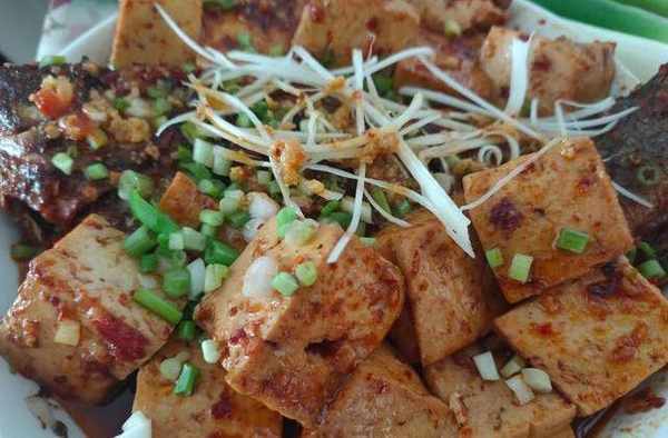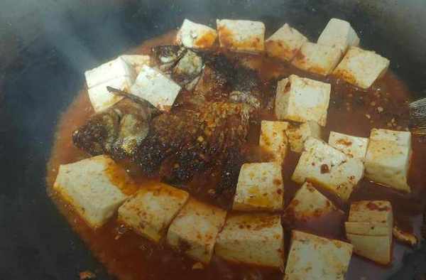 7.放入炸好的魚和豆腐大火收汁,裡面的湯汁成黏稠狀即可起鍋裝盤,起鍋前放入一點麻椒油