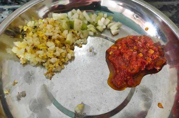 3.蔥薑蒜切粒,準備一點,紅油豆瓣和辣椒面