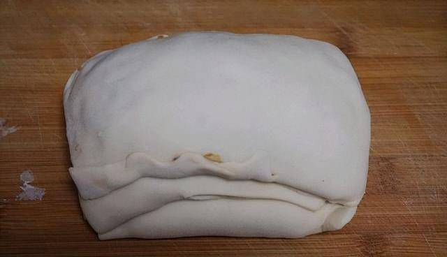 平時做餅都是一個面疙瘩搟圓然後把餡包在裡面,這個是把一個大面團直接搟成方形,薄薄的一層餡料疊加一層,當然層數也不能太多,那樣也不好弄。搟的時候輕一些,面皮不弄破的效果就可以,這樣煎出來的就會很脆。