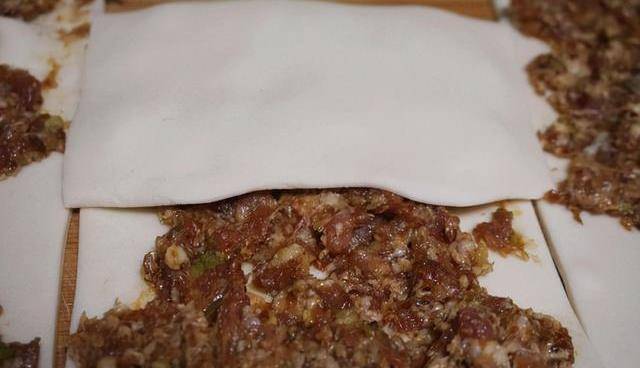 肉餡微微厚於餅皮就可以,不要太厚,要不然後面搟面的時候肯定會破。